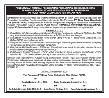 Pengumuman Putusan Pengesahan Perdamaian & Pengakhiran PKPU PT Ricky Putra Globalindo, Tbk.