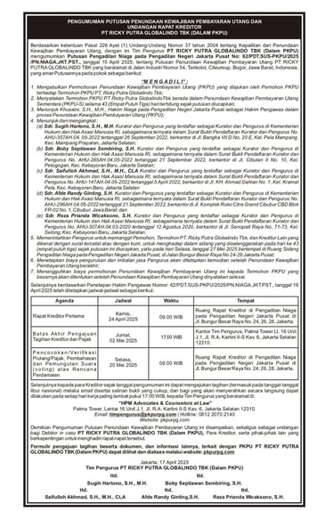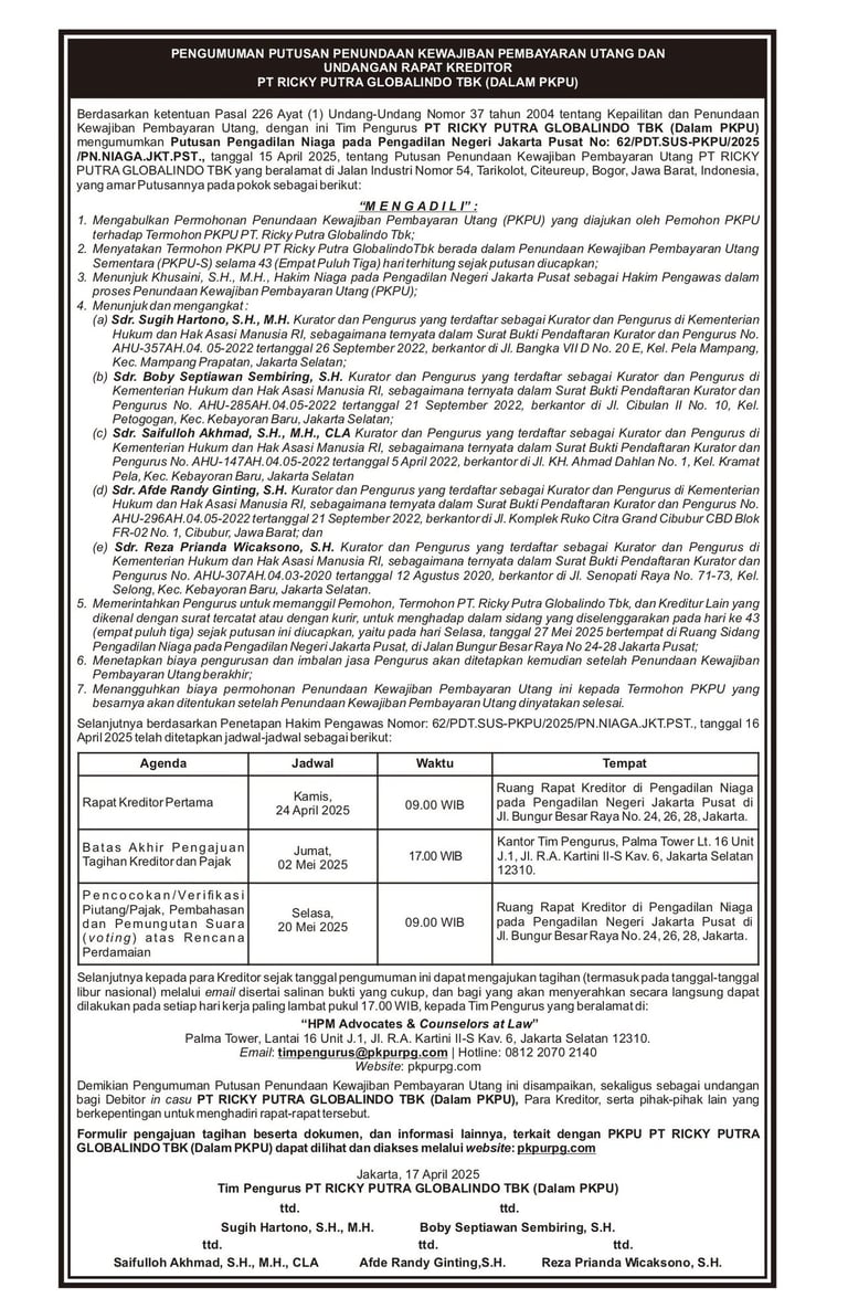 Selamat Datang Para Kreditor PT Ricky Putra Globalindo Tbk (Dalam PKPU)
